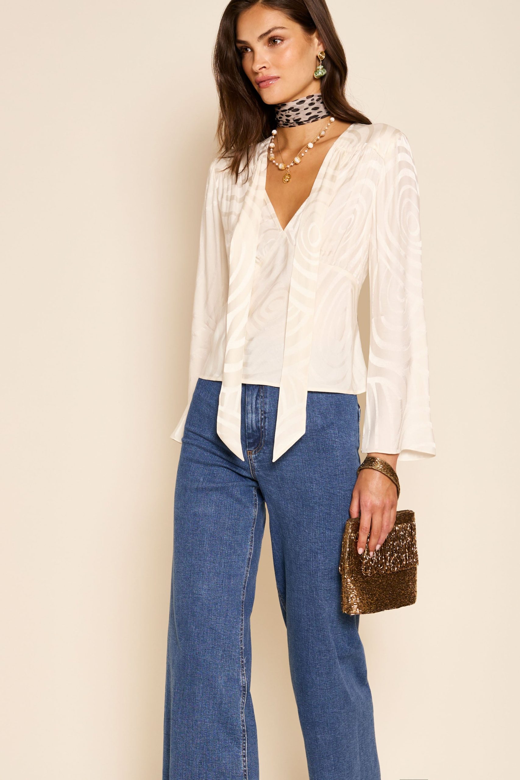 Product detailsDetailsAbel is a more fitted version of our Moss blouse, in a slightly shorter length that’s designed to be untucked. It’s made from satin jacquard with ties at the neck that we like long and loose. Wear it with your favourite jeans and skirts.Fit