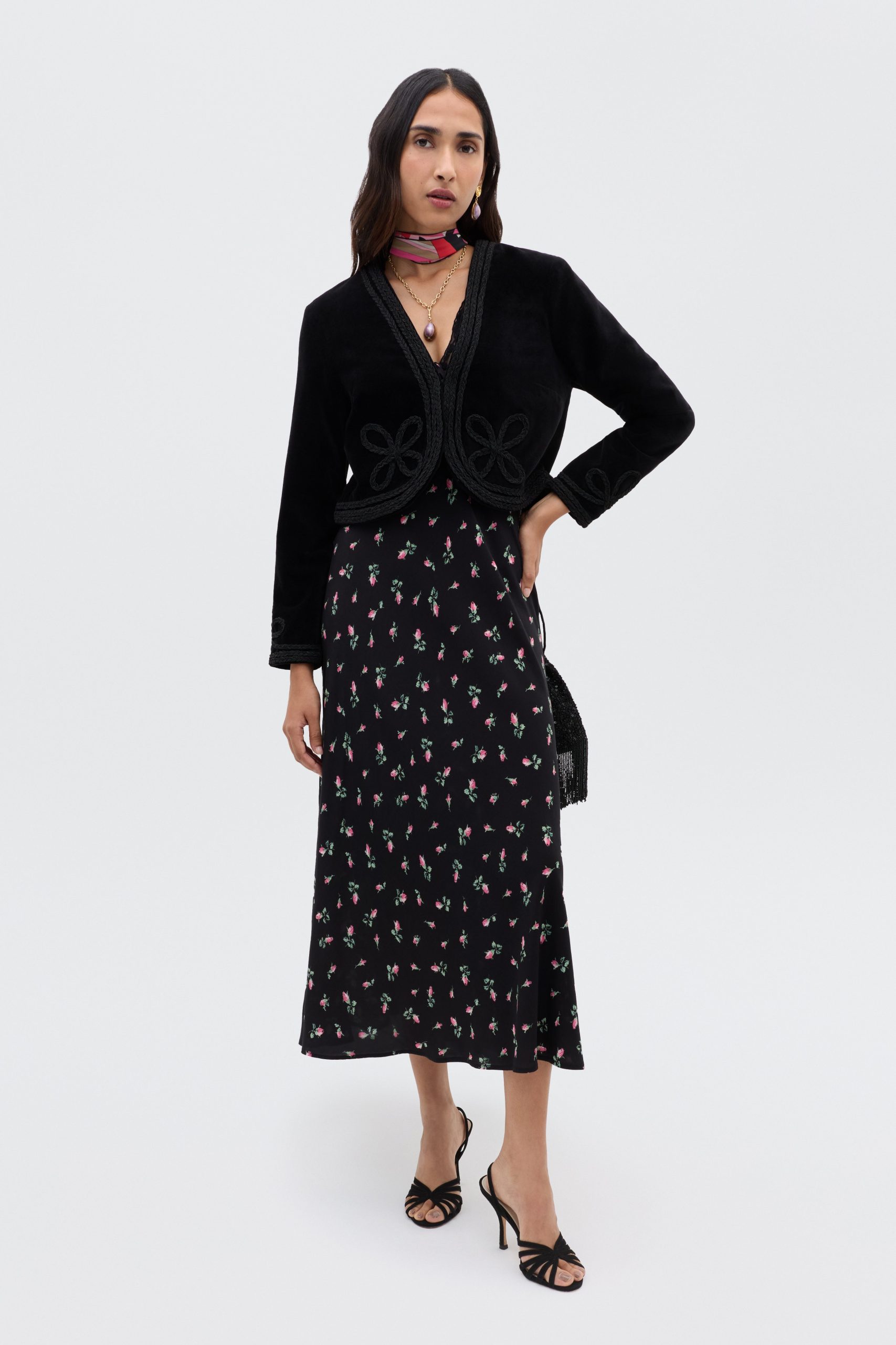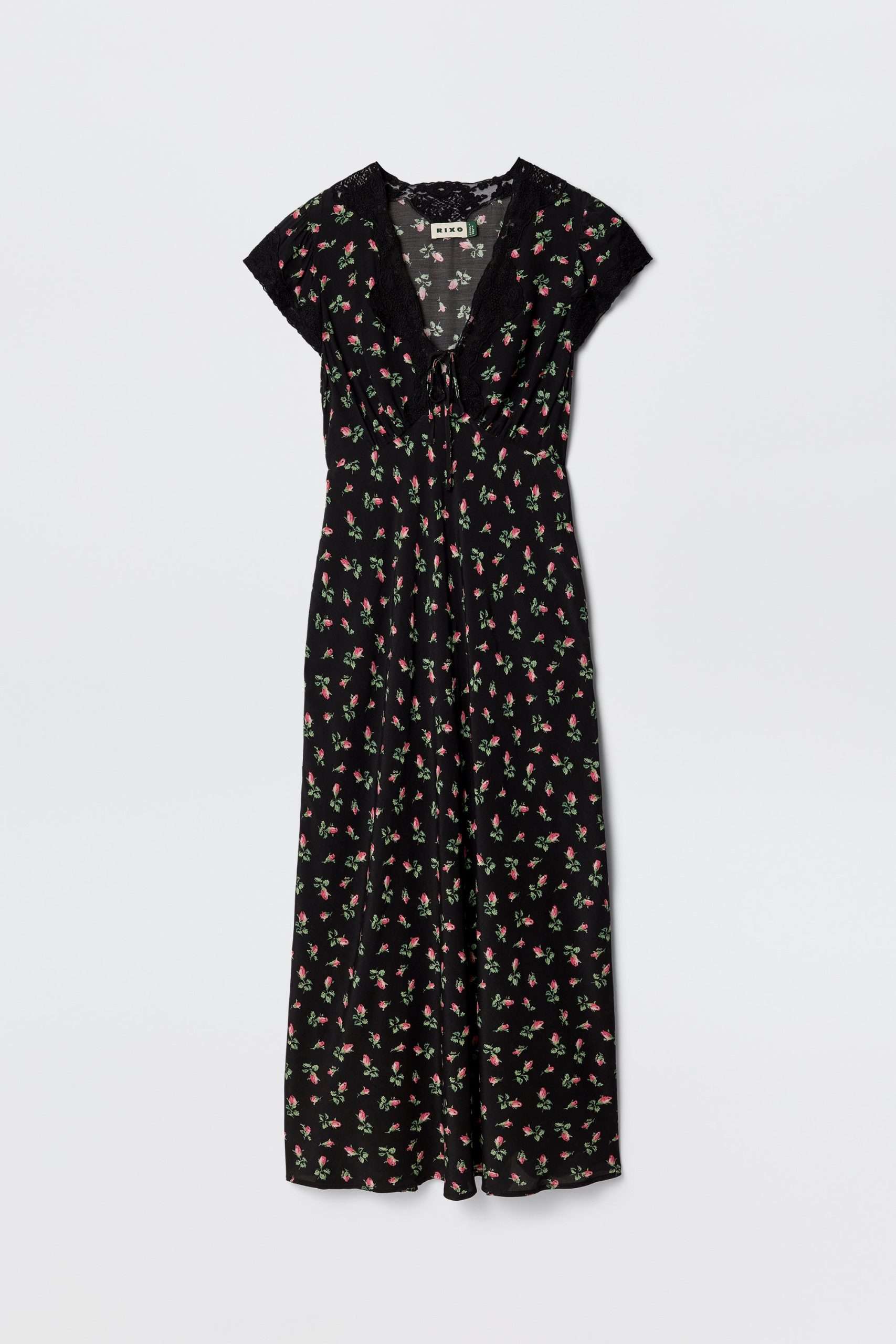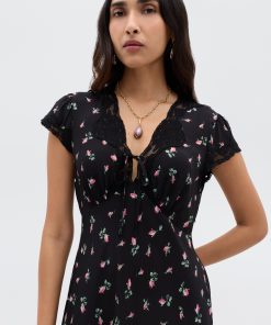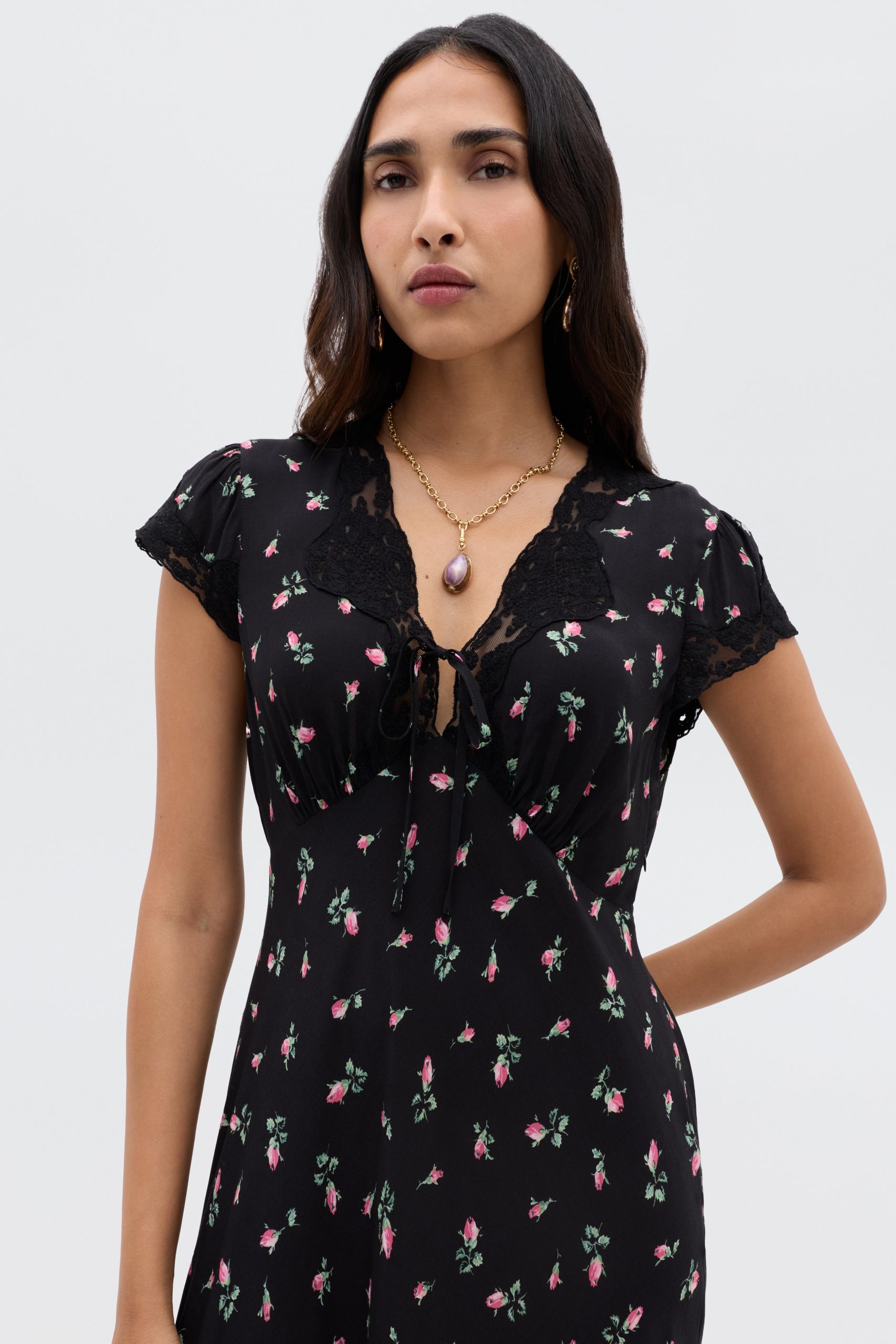 Product detailsDetailsAmari is based on our beloved Clarice dress, but the statement lace trim and Sienna Bud print gives it a romantic feel. It’s cut in our signature bias shape, with under bust seams and a tie front so you can adjust the V-neck. A timeless style for dinner dates to special occasions.Fit