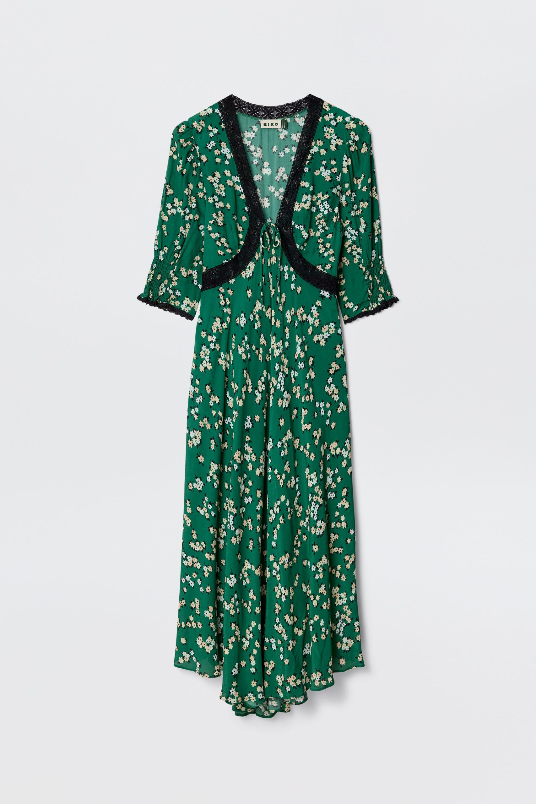 Product detailsDetailsTraced with delicate lace trims and shirred cuffs, Amina captures a romantic energy. Inspired by vintage tea dresses, it’s the ultimate every day floral dress. The cropped sleeves and asymmetrically cut hem are so flattering – wear for sun dappled afternoons or cocktails at sunset. Lightweight crepe de chine: elegant drapeFit