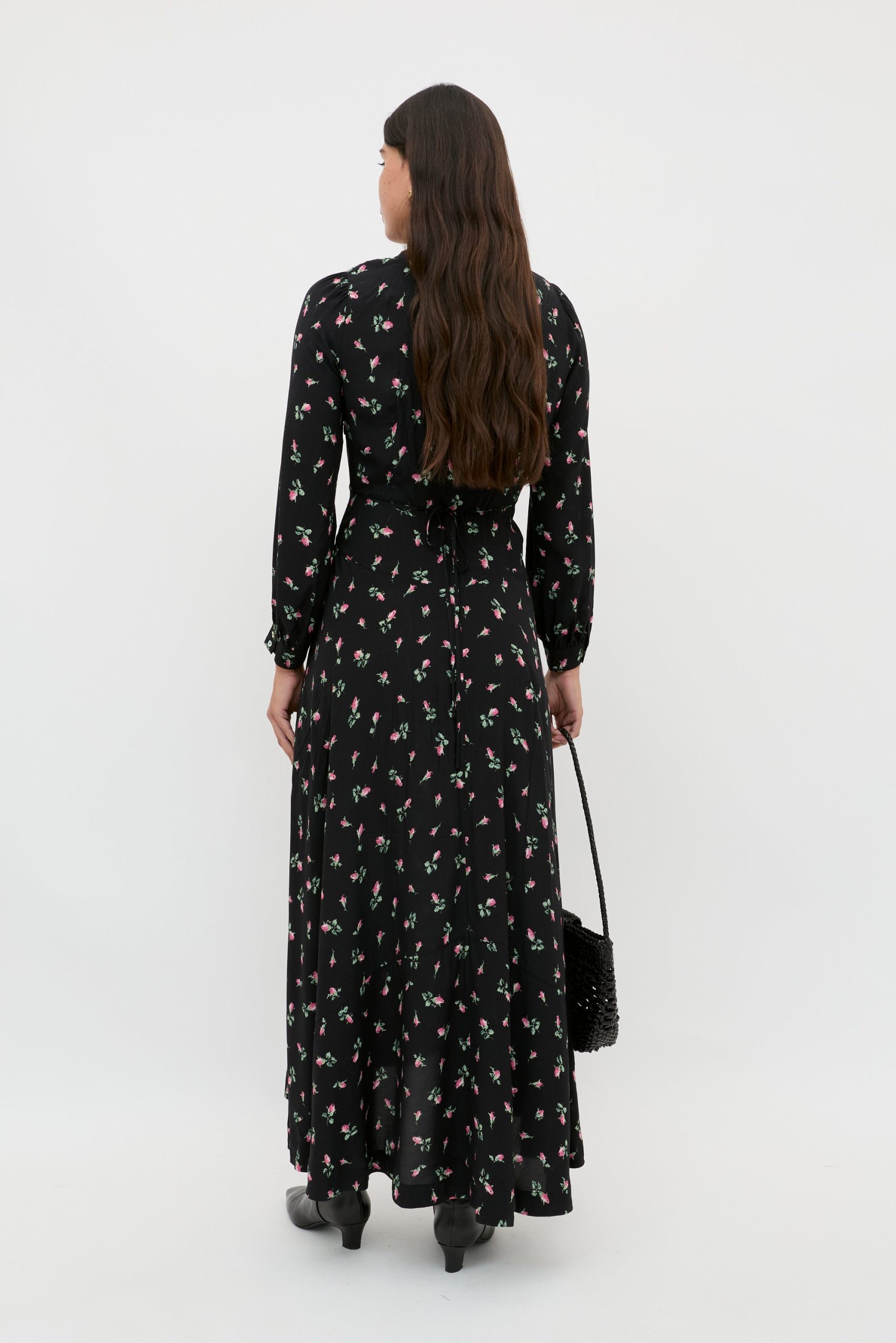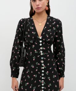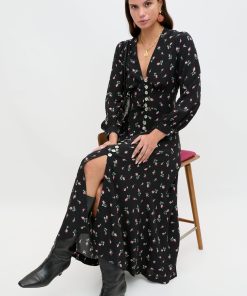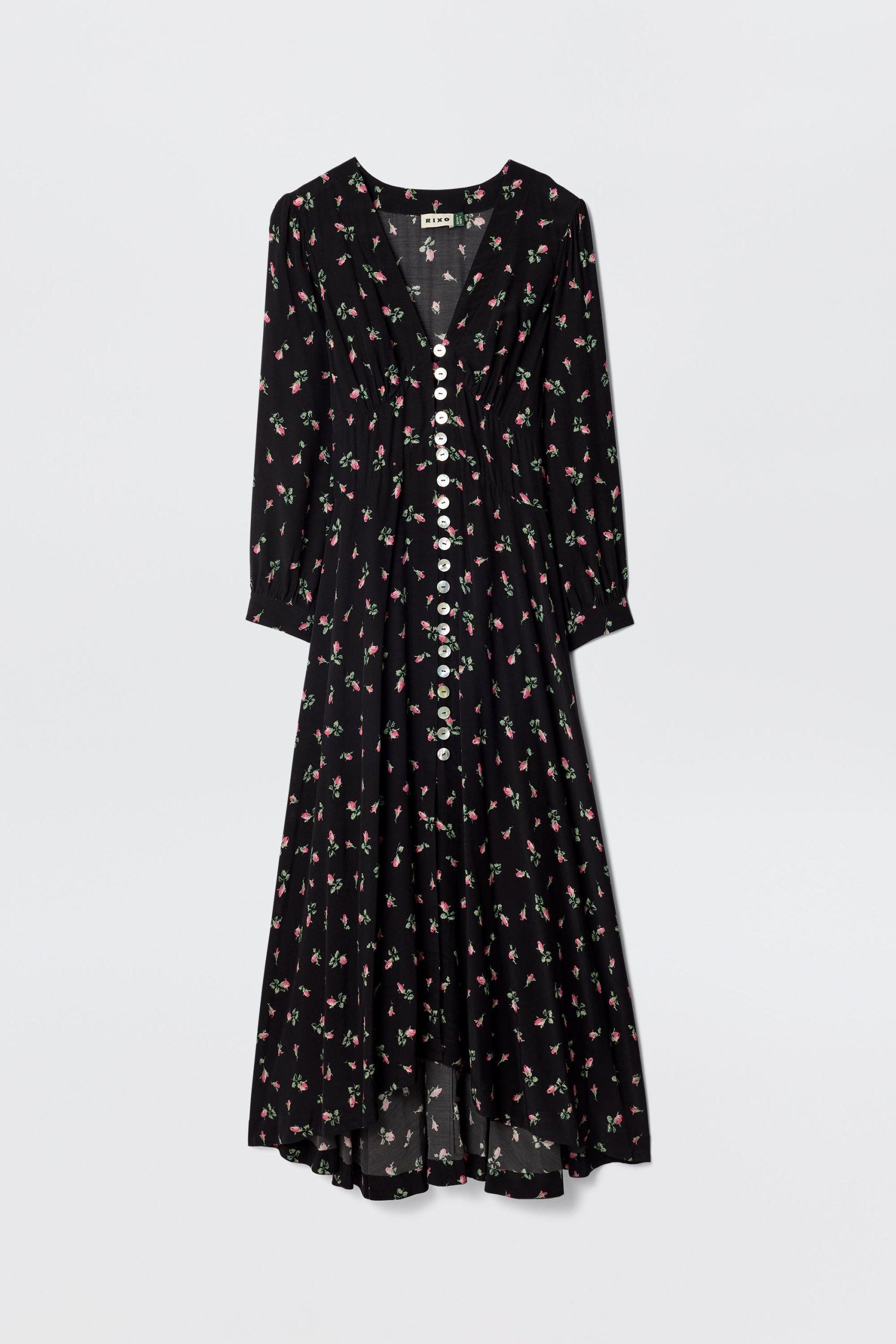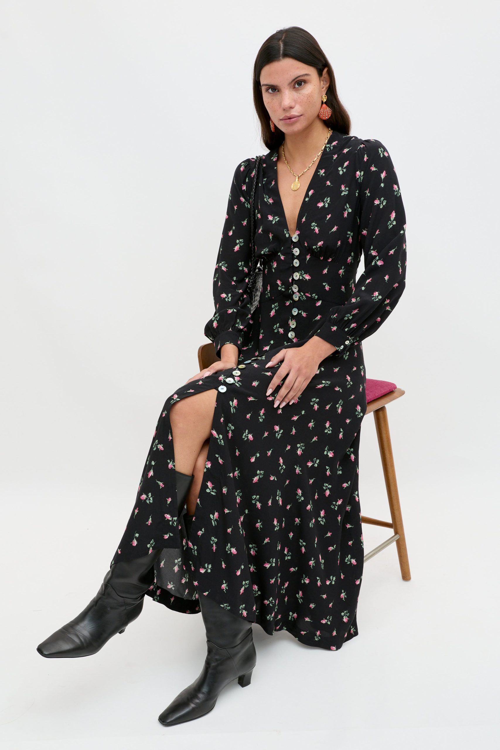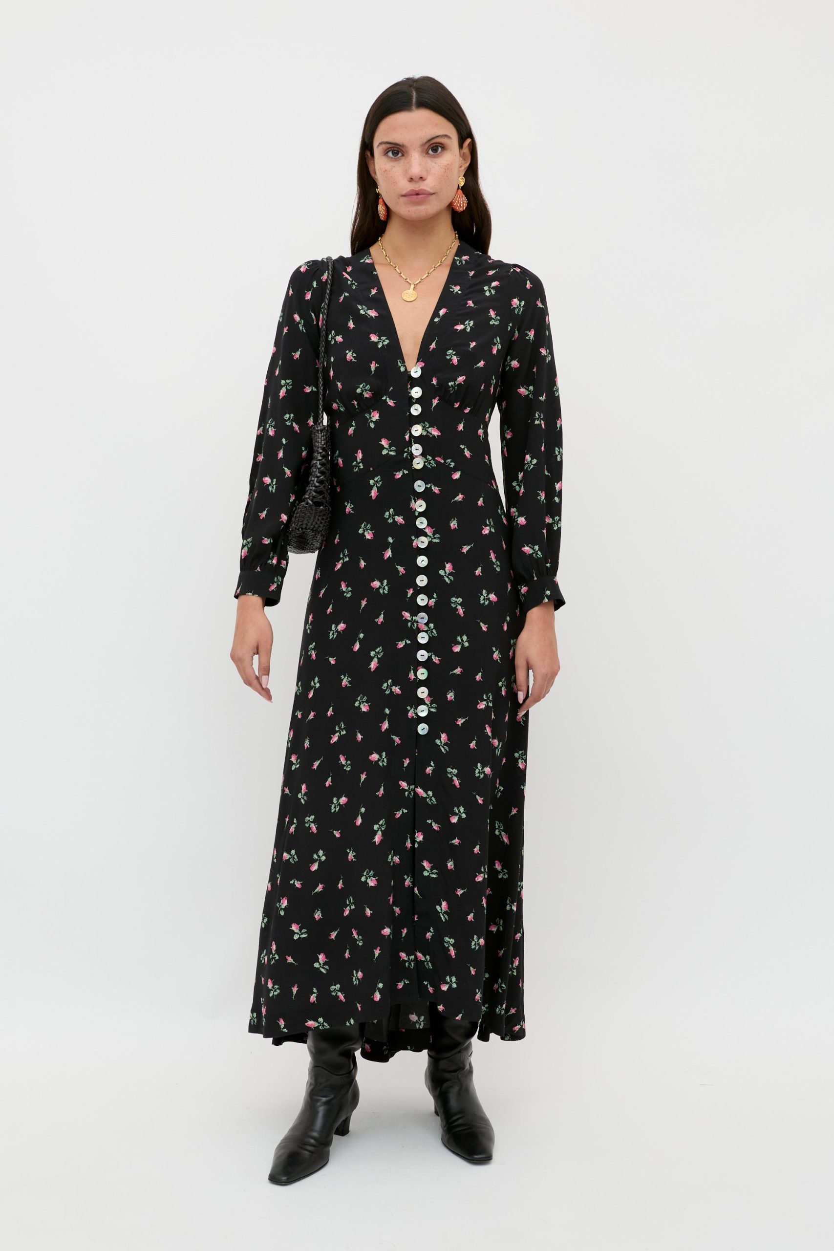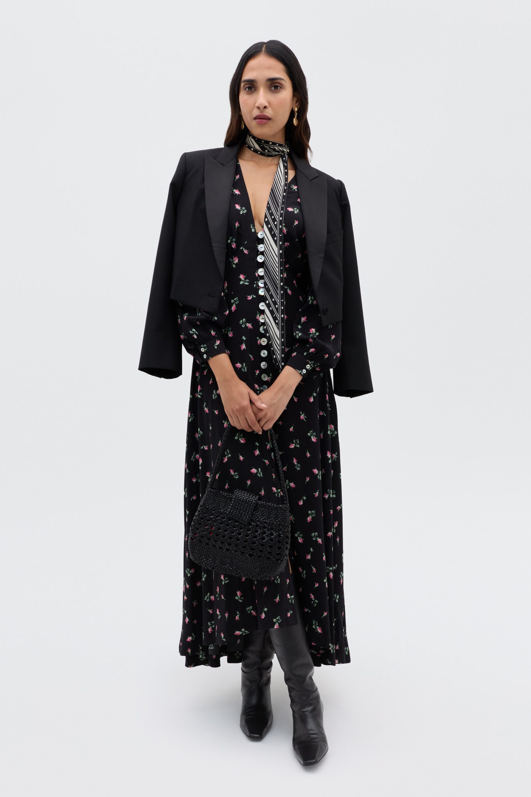 Product detailsDetailsMeet Avalyn. Inspired by our beloved Novara Midi Dress but now with long sleeves and vintage-inspired cuffs that create a beautiful billow at the wrists. Crafted from 100% silk, It’s the ultimate button-through tea dress.Fit