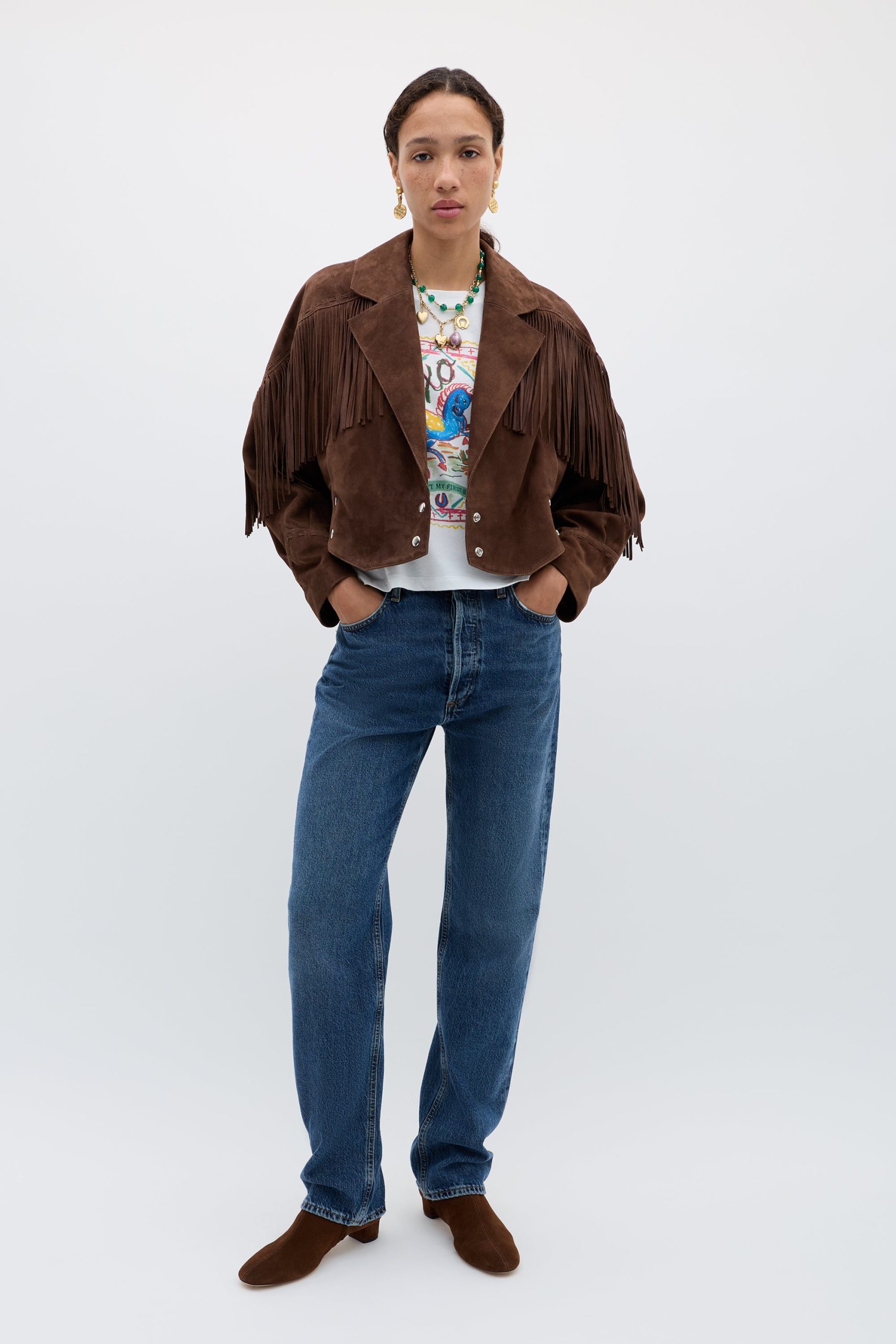 Product detailsDetailsAn heirloom piece in the making. 1970s inspired, our Darragh Jacket captures the free spirited energy of the decade. Crafted from supple suede and in a rich chocolate brown that pairs perfectly with everything from ditsy floral prints to polka dots. The ultimate piece for transitional dressing.Fit