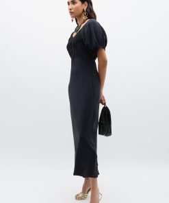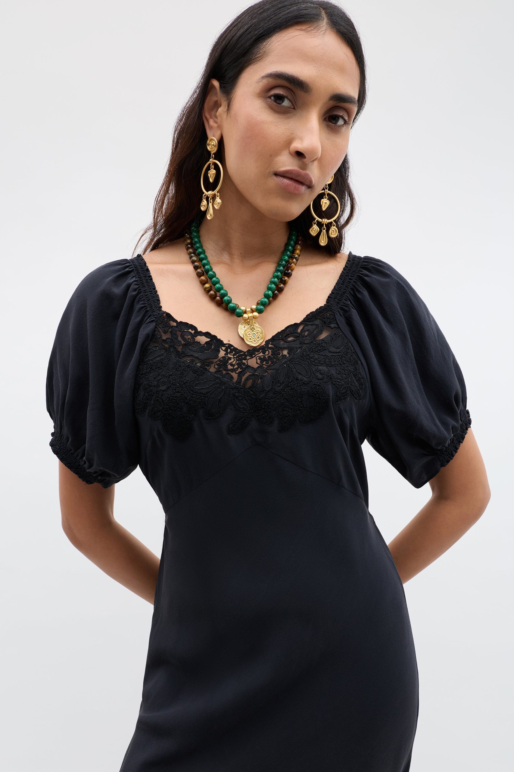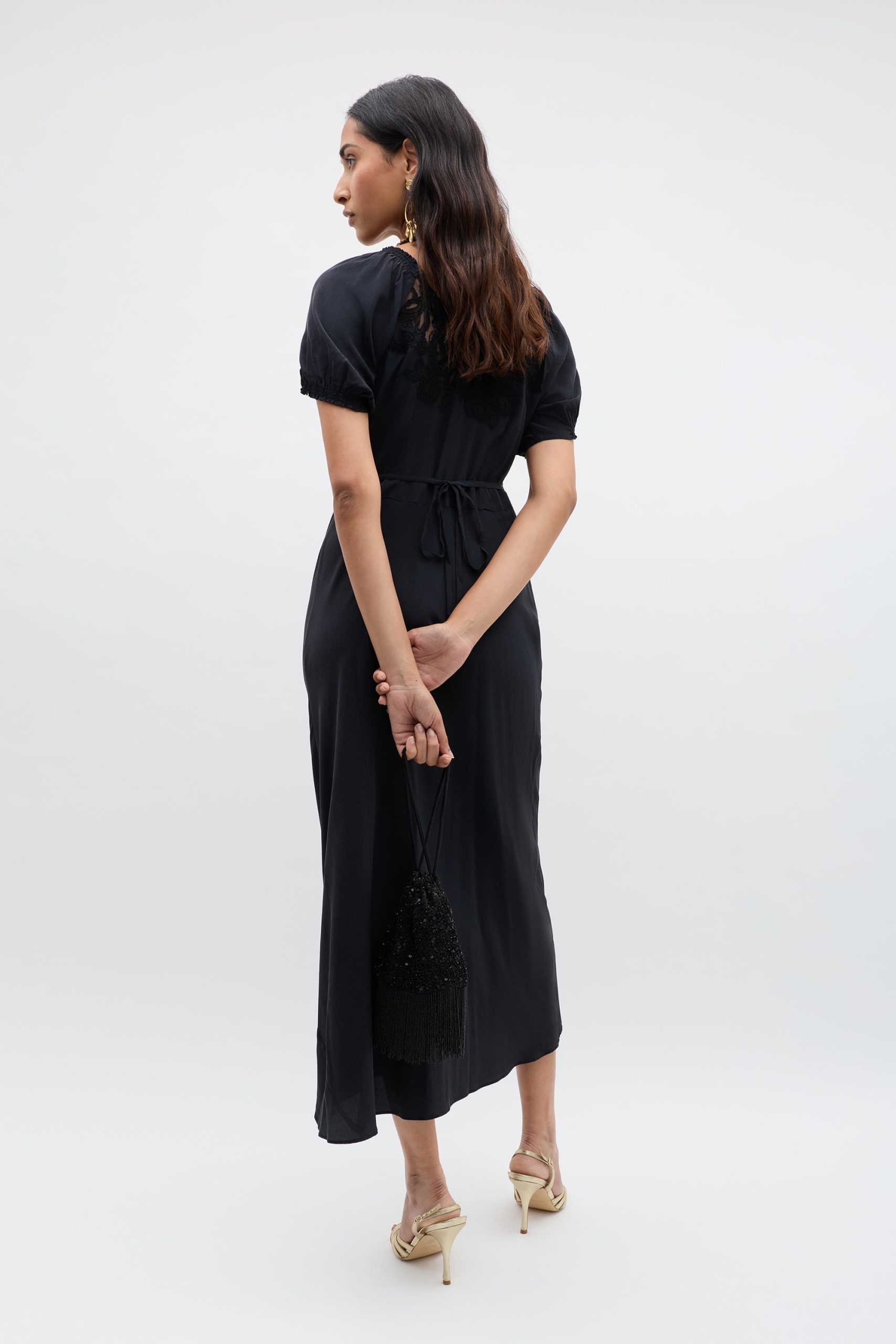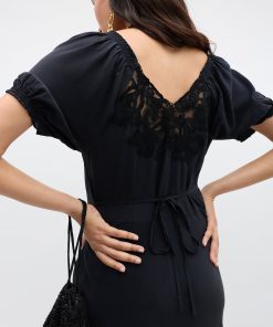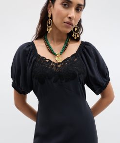 Product detailsDetailsThis black Ilaria dress is set to be your new favourite LBD. Inspired by a much-loved vintage style, its delicate lace detail, elegant bias cut and puff sleeves make it the perfect fit for every dress code.Fit