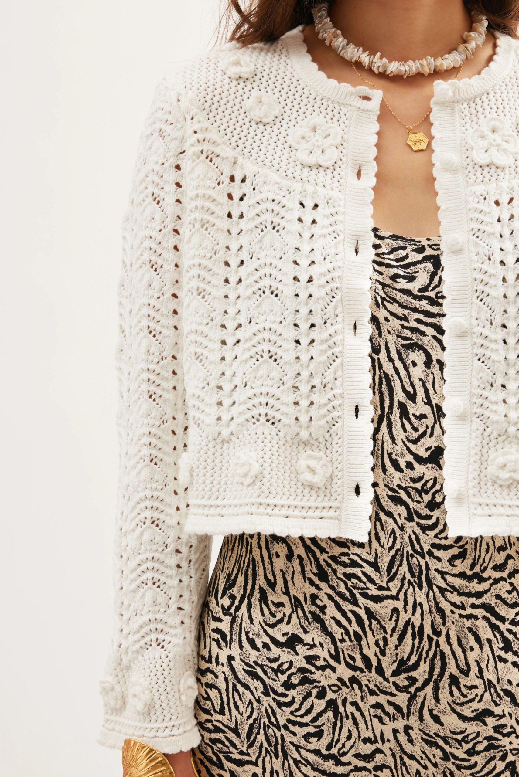 Product detailsDetailsThis cotton Kyra cardigan is crocheted for a vintage feel – it’s the perfect layer over summer dresses. The pretty flowers are crocheted by hand.Fit