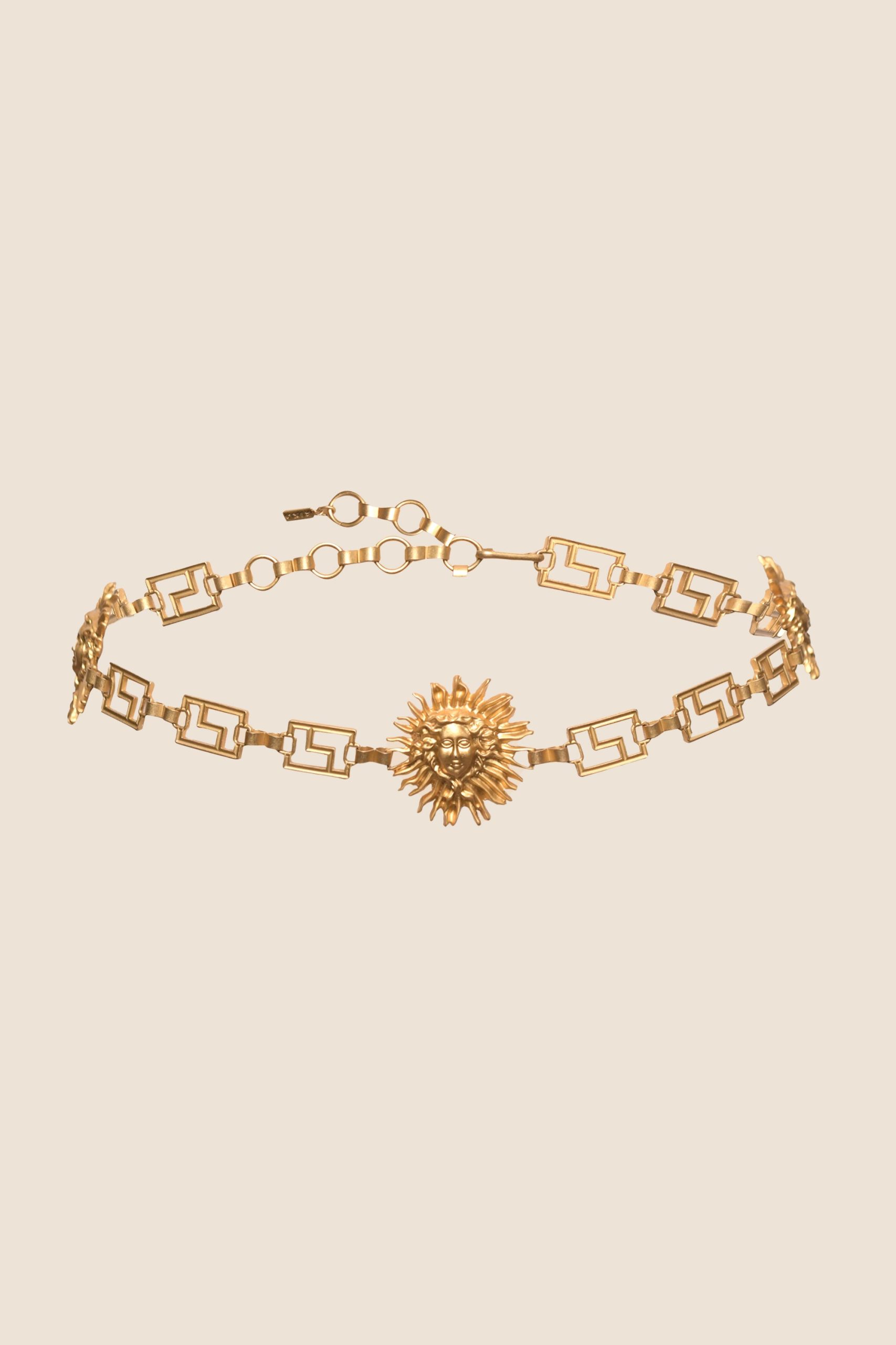 Product detailsDetailsThe Veronique chain belt’s suns are antique-gold plated and inspired by vintage Portuguese tiles seen on our Co-Founder’s trip to Goa. This adjustable style is made to comfortably cinch the waist and exclusive to our website.Fit