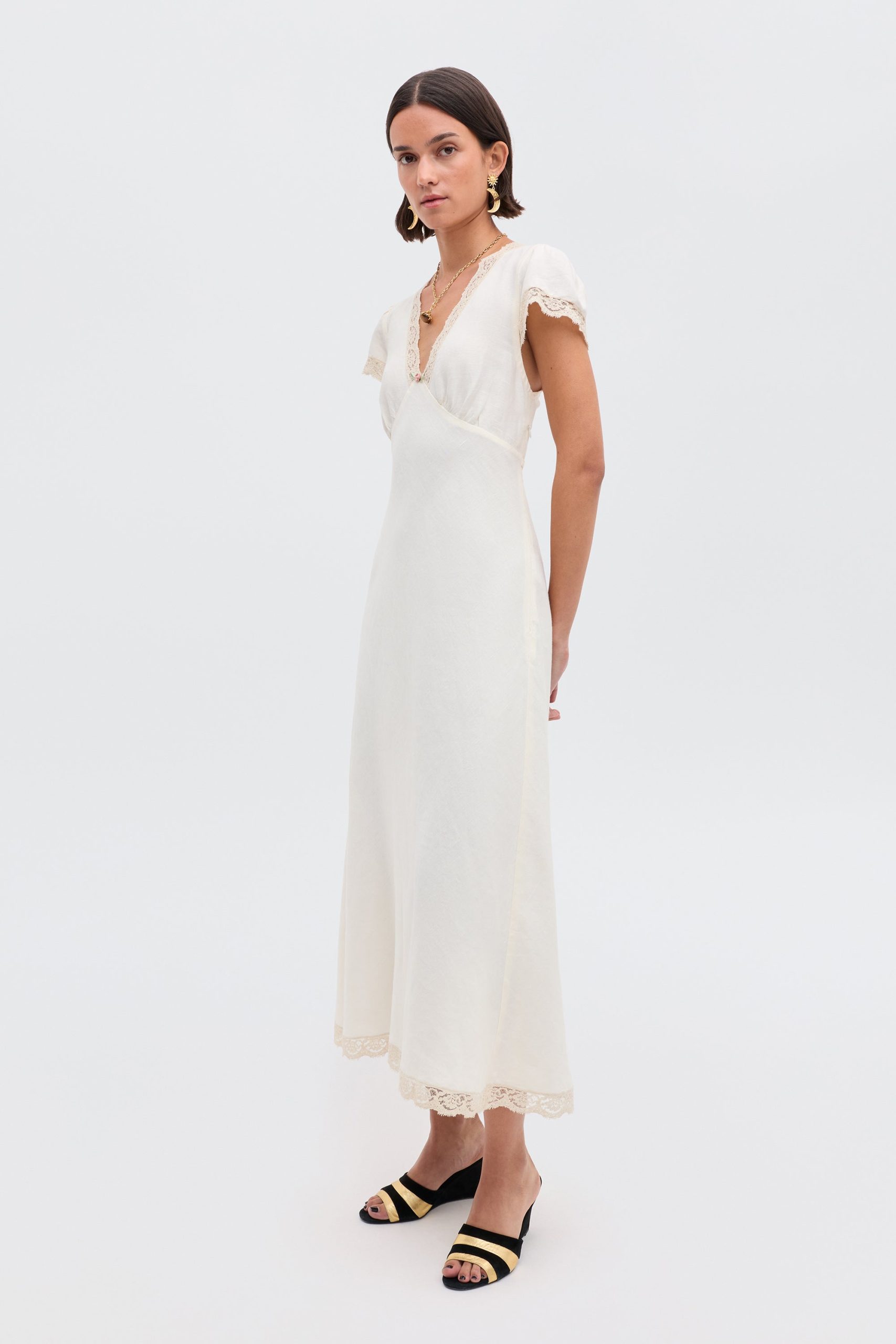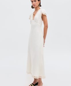Product detailsDetailsAvailable in regular and petite. Every wardrobe needs a summery white dress like this Clarice midi. It’s based on a vintage nightdress – you’ll see the inspirations in the pretty lace and dainty rose trim.Fit