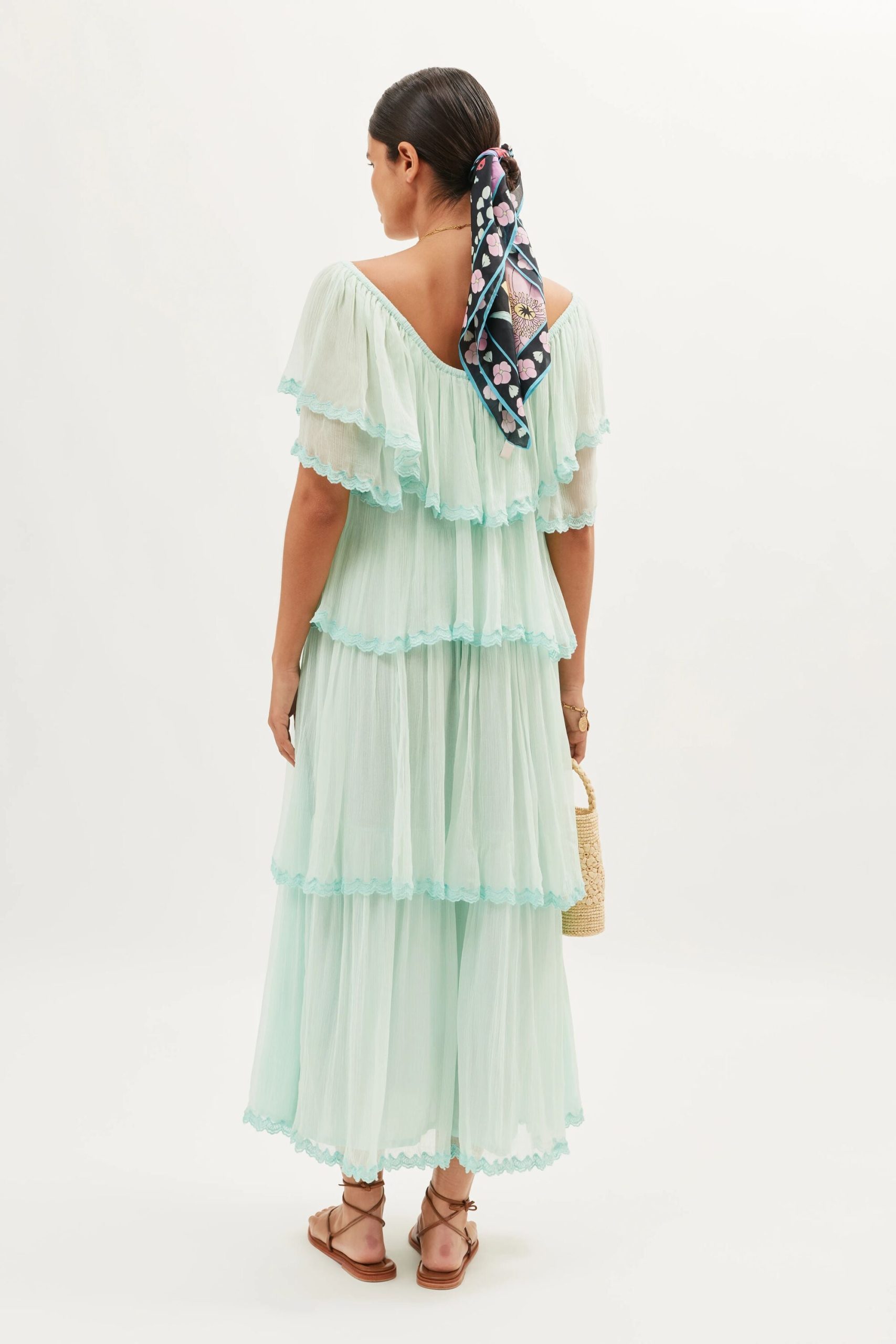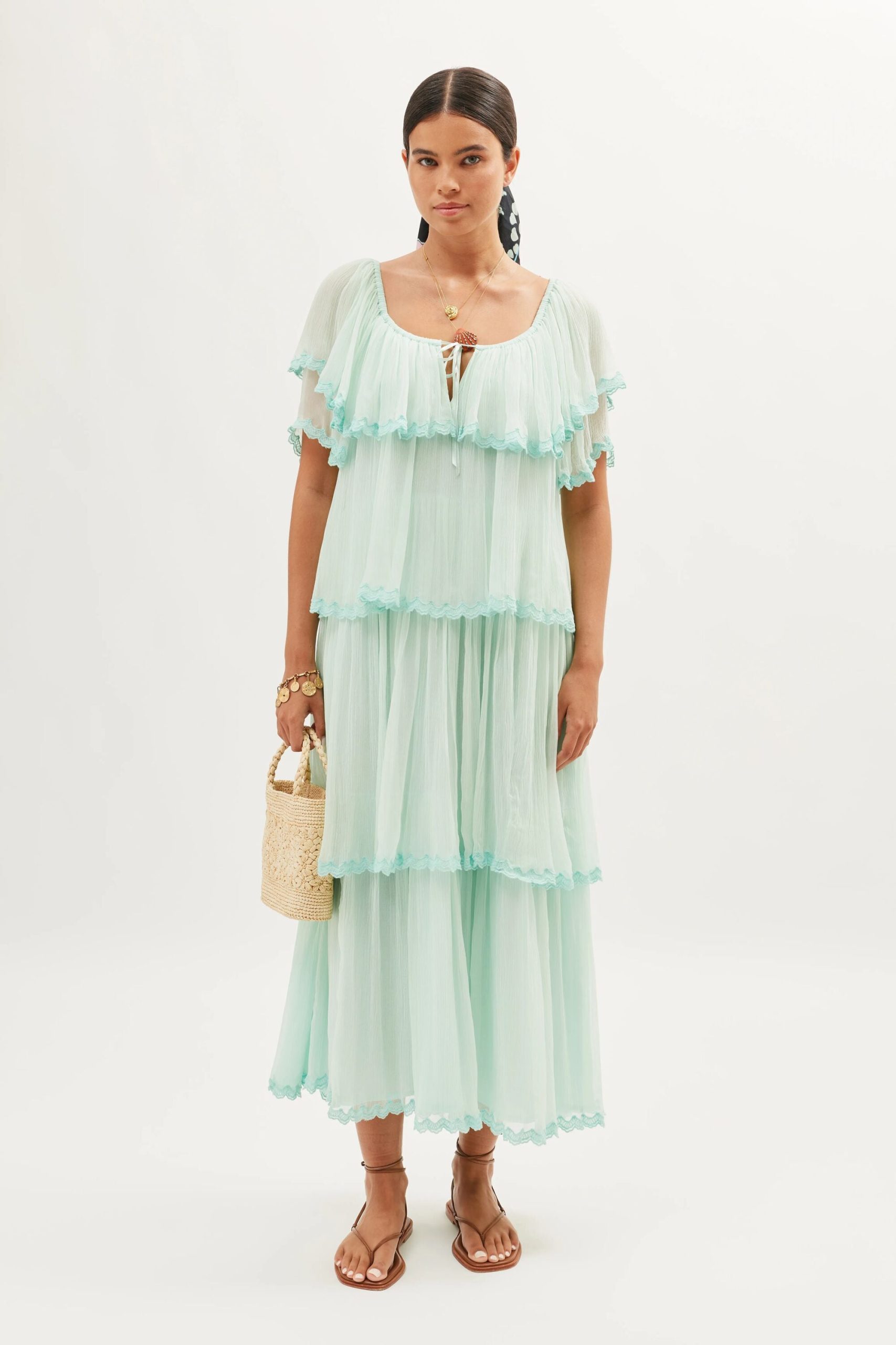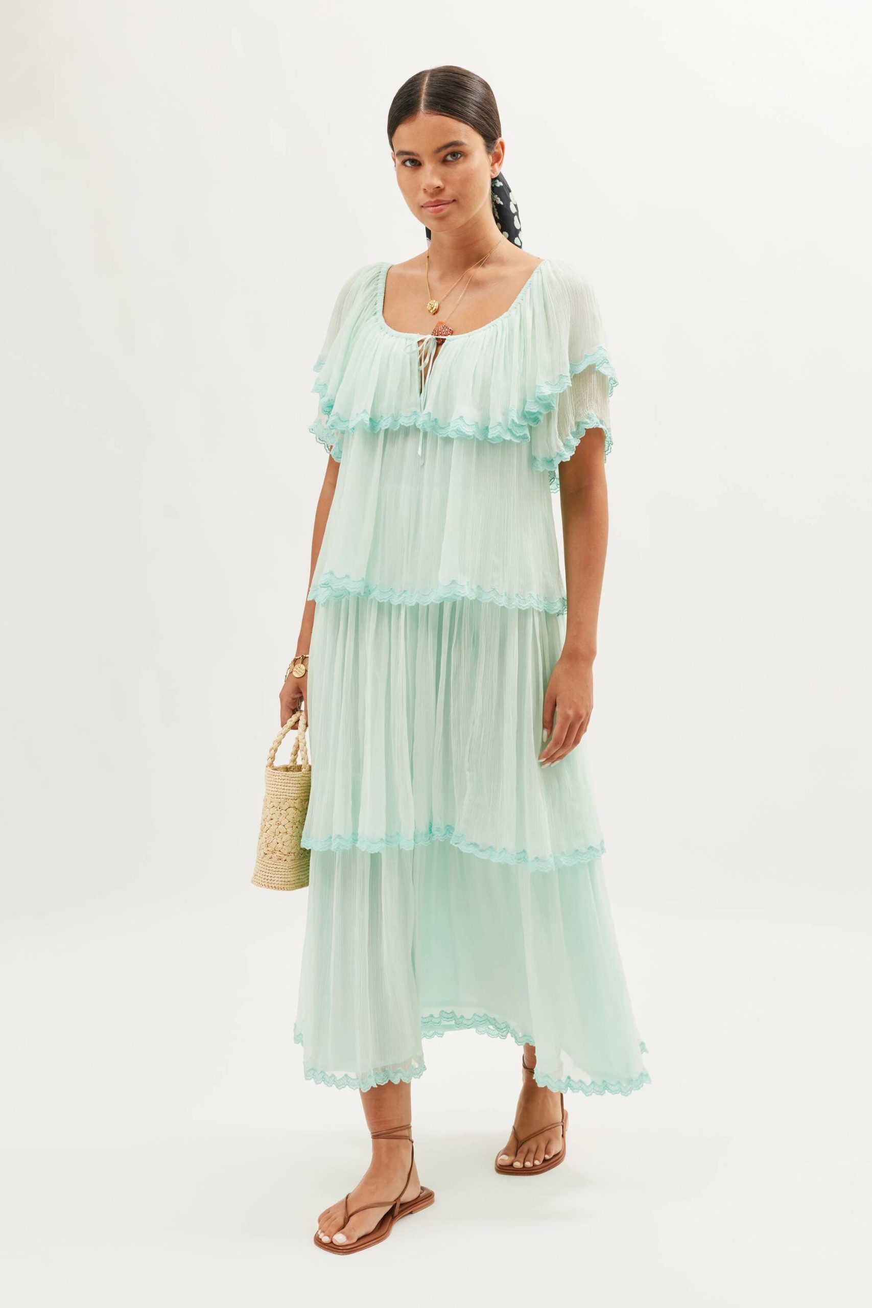 Product detailsDetailsDiscover the full exclusive RIXO x Billie Bhatia collection here. This floaty Raina dress is a new maxi silhouette for us, rendered in lush mint green. Its vintage nightie-inspired silhouette and softly tiered ruffles are made for sun-dappled days, pairing beautifully with our Kasey sandals.Fit