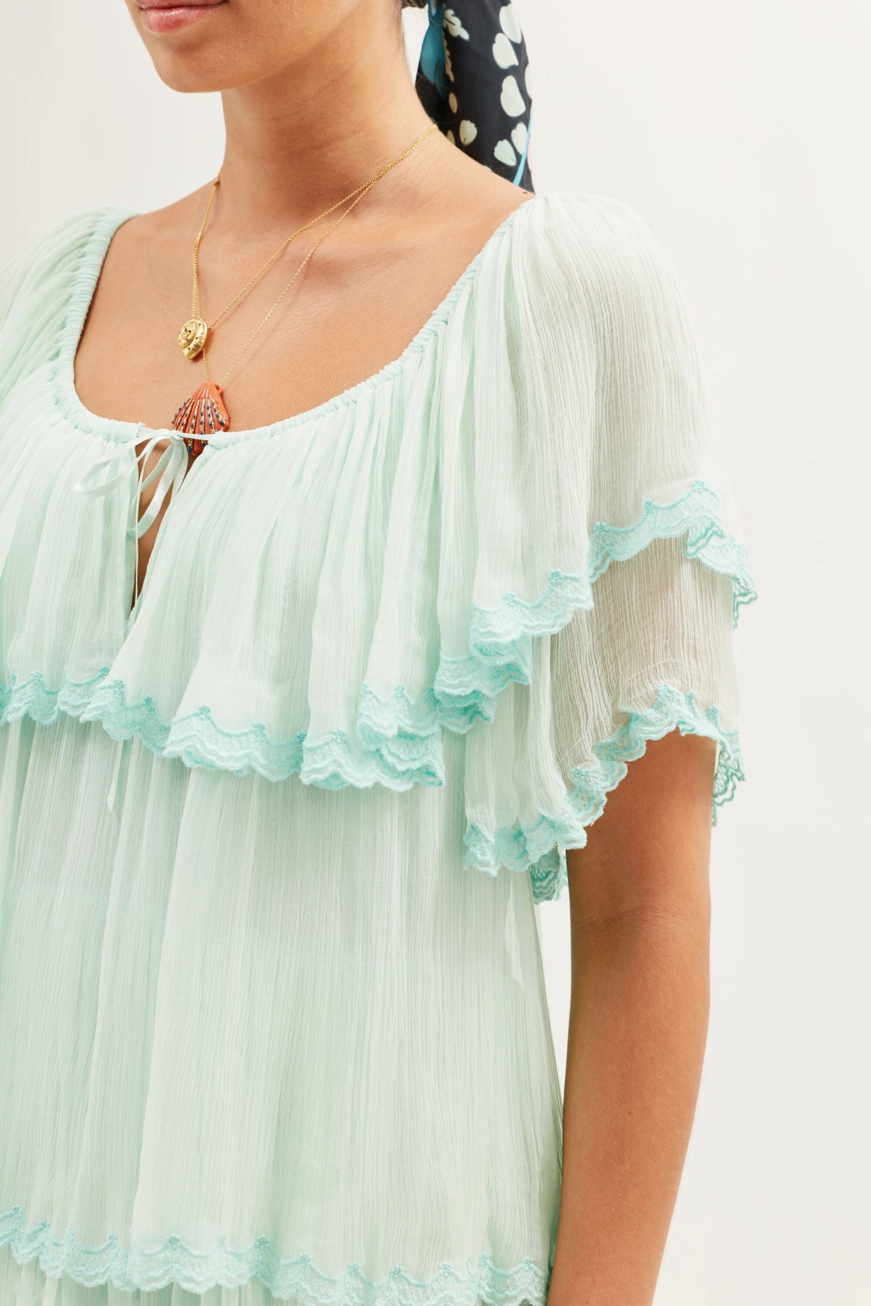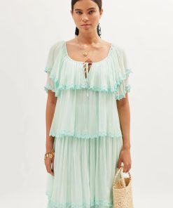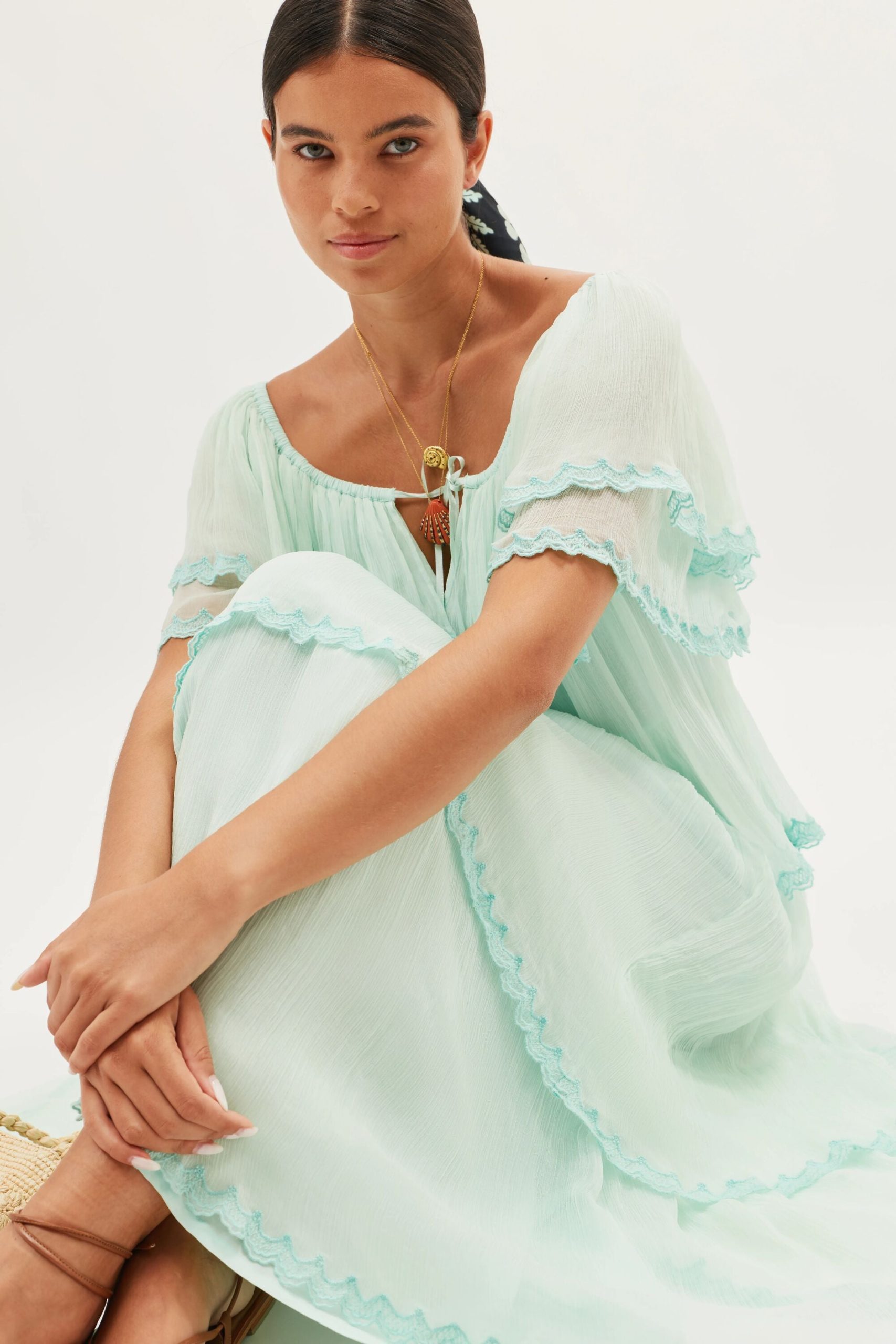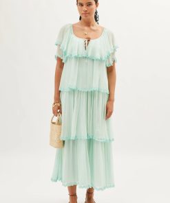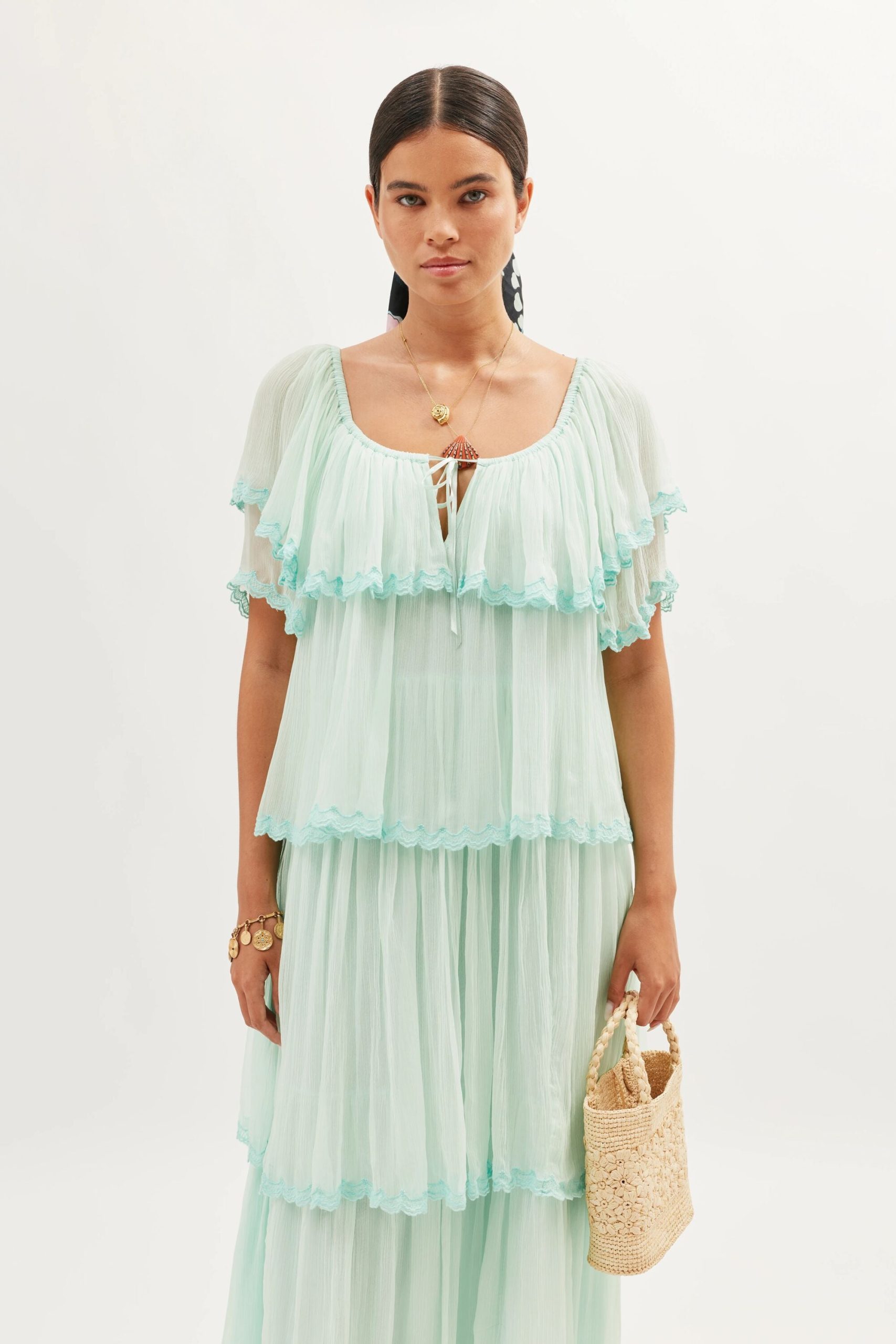 Product detailsDetailsDiscover the full exclusive RIXO x Billie Bhatia collection here. This floaty Raina dress is a new maxi silhouette for us, rendered in lush mint green. Its vintage nightie-inspired silhouette and softly tiered ruffles are made for sun-dappled days, pairing beautifully with our Kasey sandals.Fit